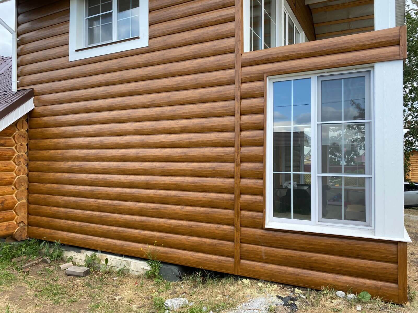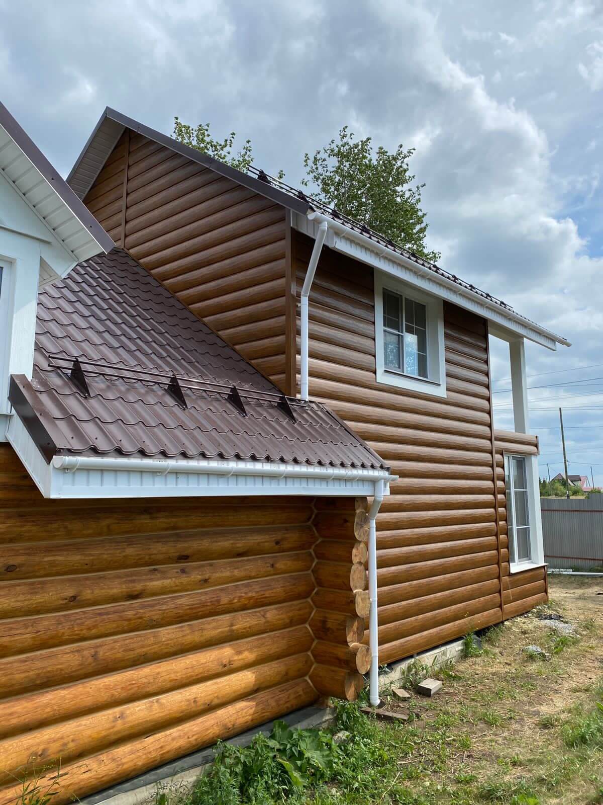 Еще один безупречно выполненный объект — фасад из "Царьсайдинга" (Бревно рубленое 4Д) в оттенке под дерево "Орех"