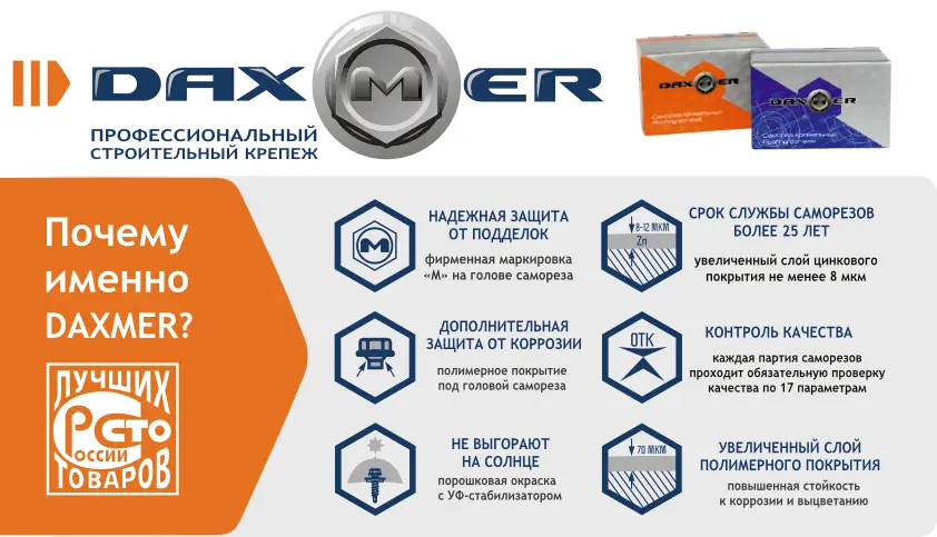 Саморез кровельный DAXMER по металлу RAL1014 Бежевый 5,5 19мм Преимущества саморезов Daxmer Упаковка саморезов Daxmer Саморезы Даксмер - 100 лучших товаров России