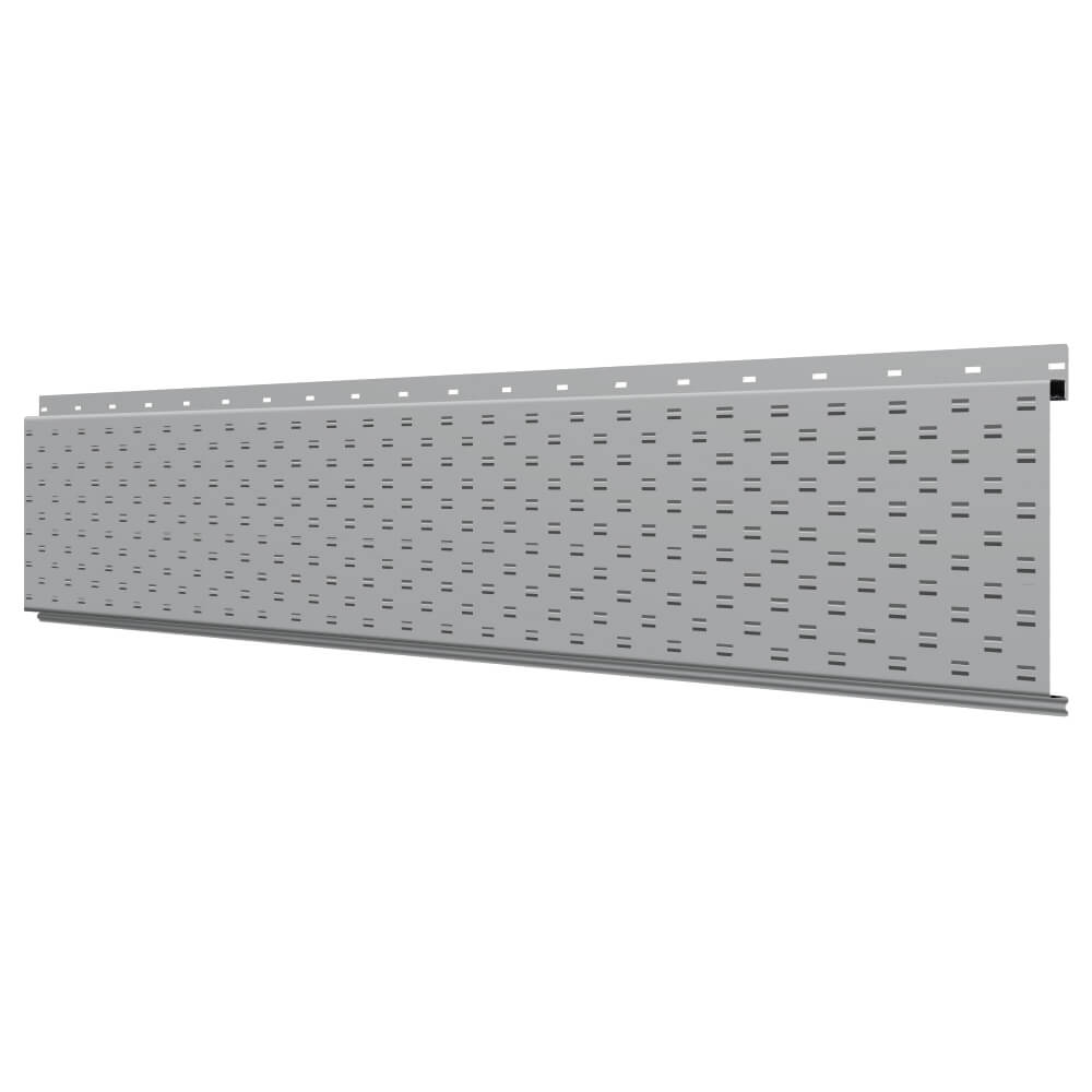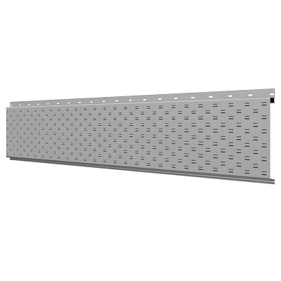 Линеарная потолочно-стеновая панель с ПЕРФОРАЦИЕЙ для вентиляции цвет RAL7004 Серый применяется в качестве софитов для подшивы крыши, наружной и внутренней отделки потолков, стен, фронтонов фасада дома в Архангельске.