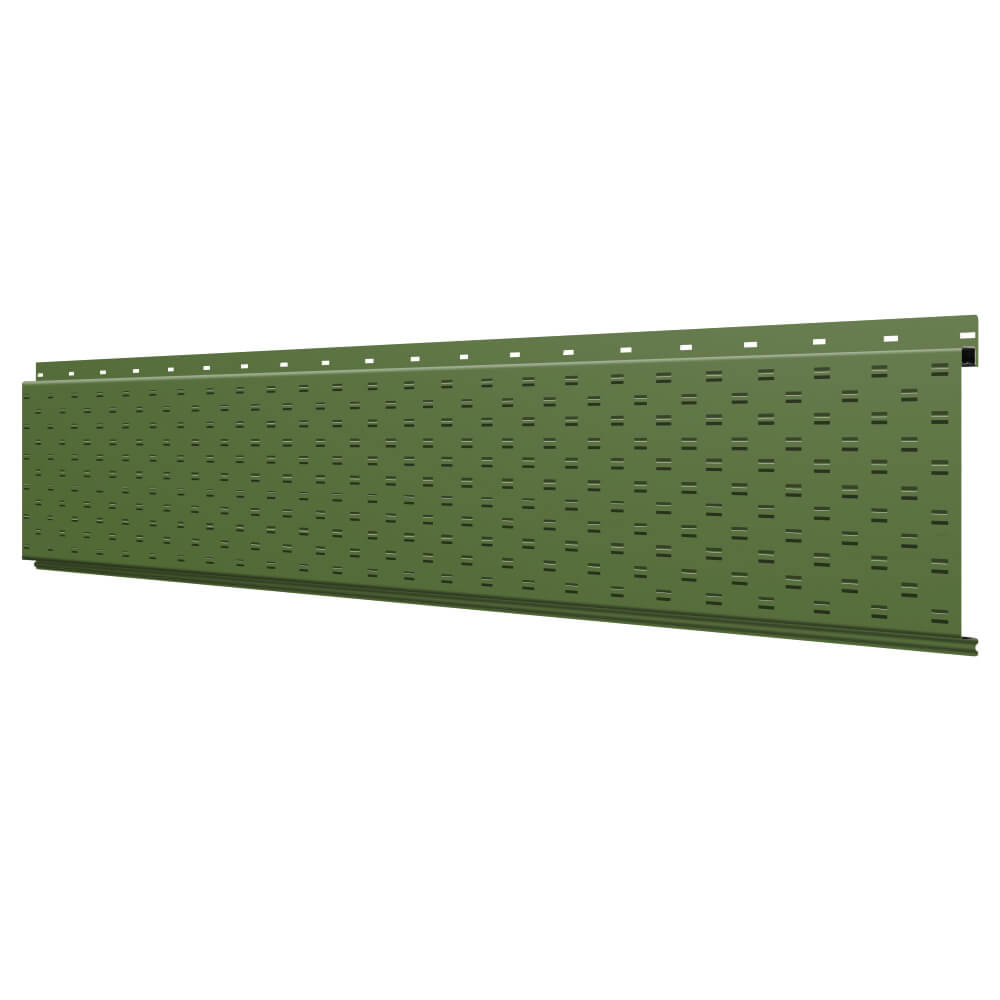 Линеарная потолочно-стеновая панель с ПЕРФОРАЦИЕЙ для вентиляции цвет RAL6002 Зеленый Лист применяется в качестве софитов для подшивы крыши, наружной и внутренней отделки потолков, стен, фронтонов фасада дома в Архангельске.