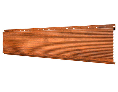 Линеарная потолочно-стеновая панель РИФЛЕНАЯ усиленная цвет под дерево Кедр Темный 3Д SteelArt Россия применяется в качестве софитов для подшивы крыши, наружной и внутренней отделки потолков, стен, фронтонов фасада дома в Архангельске.