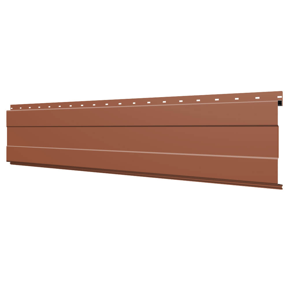 Линеарная потолочно-стеновая панель с ПОЛОСОЙ усиленная цвет RAL8004 Терракотовый применяется в качестве софитов для подшивы крыши, наружной и внутренней отделки потолков, стен, фронтонов фасада дома в Архангельске.