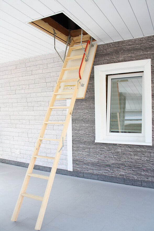 Древесина хвойных пород и белый люк позволяют лестнице вписаться в любой интерьер. В сложенном виде лестница не занимает много места, а крышка люка становится почти незаметна.