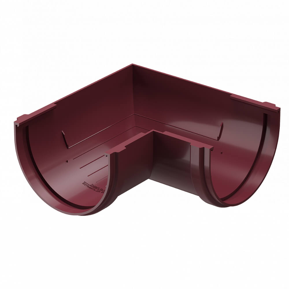 Угловой элемент желоба универсальный ДЕКЕ STANDARD d120мм 90 градусов цвет RAL 3005 Красный в Архангельске. Угловые элементы устанавливаются как на внешних, так и на внутренних углах кровли и предназначены для соединения желобов.