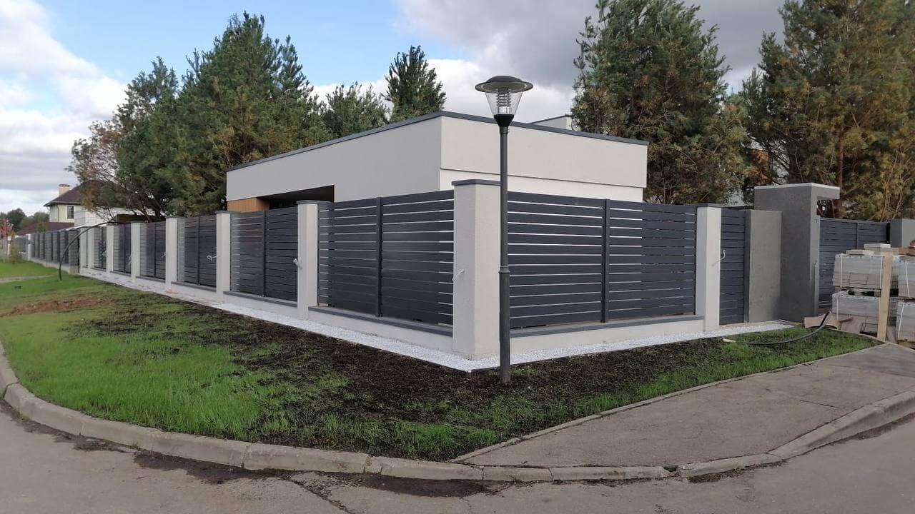 Горизонтальный секционный забор типа ранчо из металлопланкена с покрытием полиэстер цвет RAL 7024 Серый Графит односторонний