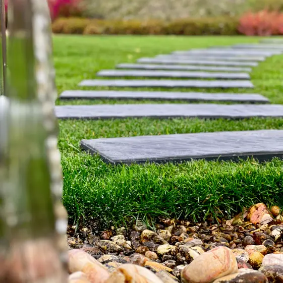 Аккуратное современное решение для оформления садовой дорожки с использованием шаговой плиты Stone из полимерпесчаного материала в цвете Графитовый Серый. Стильные и лаконичные плиты гармонично вписались в общий ландшафтный дизайн, создавая удобный и эстетичный маршрут по участку. Материал отличается прочностью и устойчивостью к атмосферным воздействиям, что обеспечивает долгий срок службы покрытия без потери внешней привлекательности. Благодаря нейтральному графитовому оттенку дорожка органично сочетается как с зеленью сада, так и с декоративными элементами благоустройства.