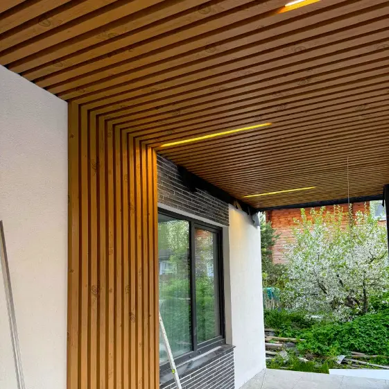 Декоративная кубообразная рейка с 3D покрытием под дерево Светлый Дуб — универсальное решение для создания стильного и современного экстерьера дома. Изделие отличается высокой прочностью, устойчивостью к влаге и ультрафиолету, что делает его отличным выбором для наружного применения. Благодаря натуралистичной текстуре под дерево и приятному светлому оттенку она идеально вписывается в оформление фасадов и потолочных конструкций входных групп.