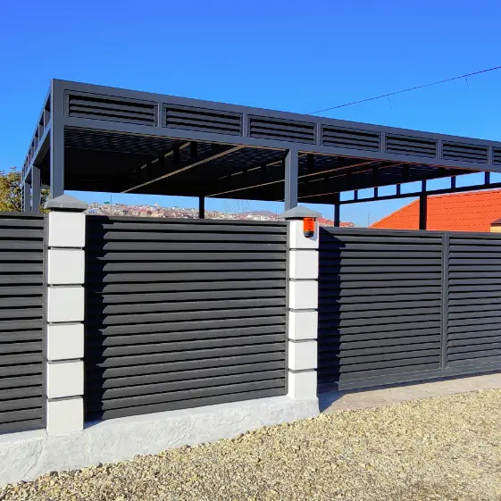 Гармоничное сочетание практичности и эстетики: для ограждения участка и навеса под автомобиль использованы ламели собственного производства «Еврожалюзи» RAL 7024/7024 Серый графит с двусторонним покрытием полиэстер. Единый стиль в оформлении забора-жалюзи и конструкции навеса обеспечивает цельный архитектурный образ, подчеркивая современный характер территории. Материал отличается высокой стойкостью к атмосферным воздействиям, что гарантирует долговечность и сохранение насыщенного цвета в течение всего срока эксплуатации. Такое решение не только обеспечивает надежную защиту и уединение, но и придает объекту элегантный и аккуратный внешний вид.